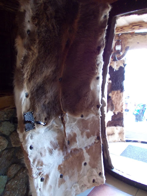 În cabană se ajunge pe uși bombate, ca două jumătăți de butoi, capitonate cu piei de capră. Podeaua barului este din lemn, din bușteni de diferite dimensiuni întăriți cu praf de lemn și clei. Nu am văzut până acum așa ceva, arată foarte bine și cred că s-a făcut și economie de materiale.